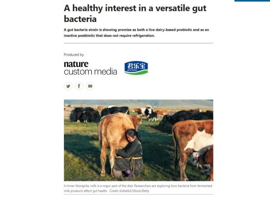 近日,君乐宝乳业集团在益生菌领域的科研成果获得国际顶级学术期刊《Nature》的关注与报道。该期刊刊登了题为《A healthy interest in a versatile gut bacteria》的专题文章,展现了君乐宝在功能性益生菌研究上的重要突破。这不仅标志着君乐宝的科研实力赢得了国际权威认可,也为其持续推动产学研深度融合、引领行业创新提供了有力的国际化学术支撑。
